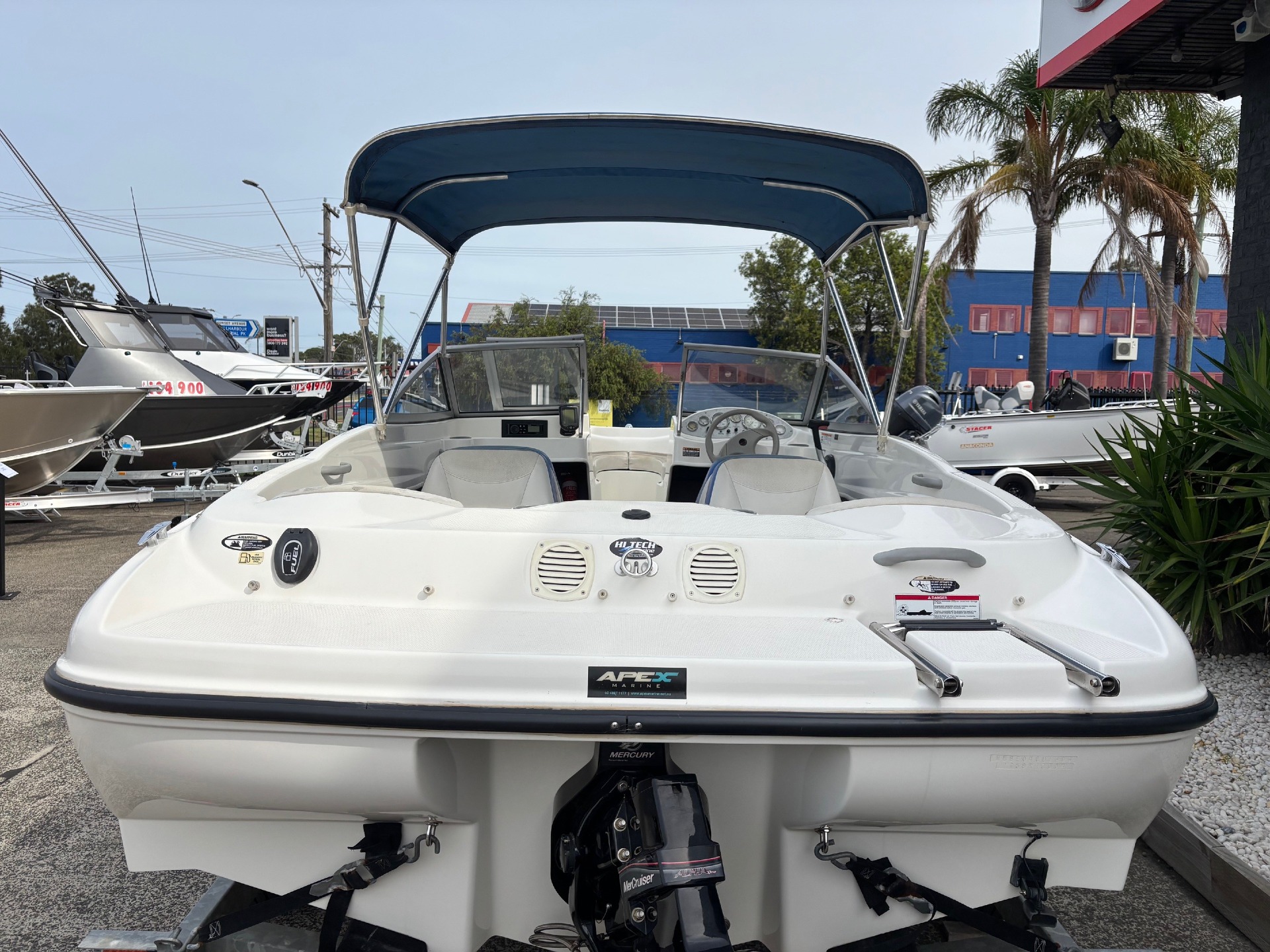 But that's not all - blast your favorite tunes on the Fusion Sound System and navigate with ease using the Humminbird Piranha MAX215. Plus, the included Bimini top provides shade on sunny days.
